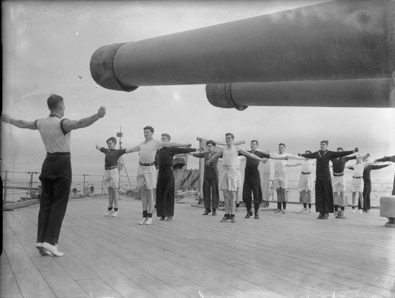One of my favourite images – both as a photo and for its rich evocation – is of physical training being carried out by the ship’s company among the massive guns of a Dreadnought-style battleship. Although I cannot find that particular photo, that of boy seamen exercising among the guns of HMS Malaya may give some of its flavour.