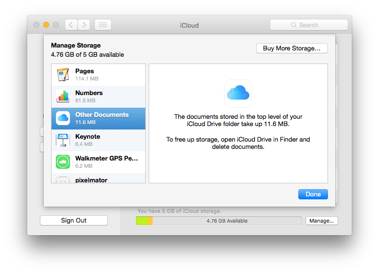 In OS X, the central controls are in the iCloud pane in System Preferences, where you set which iCloud services you use. Click on the Manage… button at the bottom right, and you can then see the storage use broken down by application, including general iCloud Drive use.