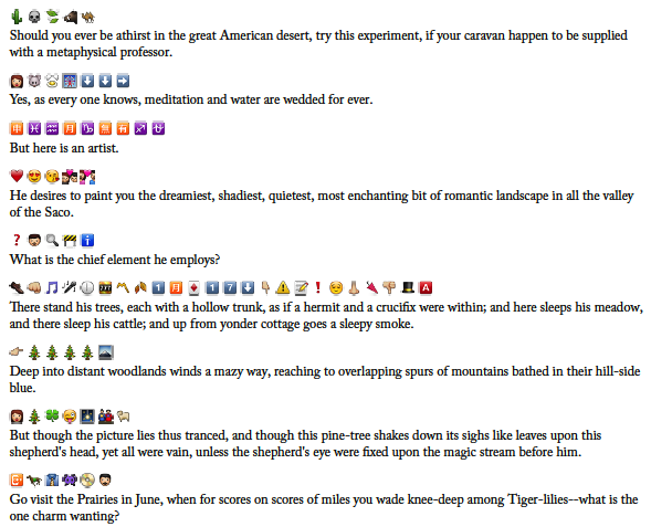Excerpts from the emoji epic translation of Moby Dick, known as Emoji Dick, illustrate this well. When the PDF is viewed at 100%, its text remains quite legible (particularly for the myopic) but it is impossible to decipher the emoji.
