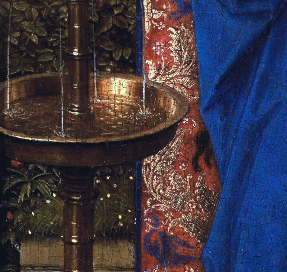 The great majority of the surface of the Madonna and Child at the Fountain (1439) is, as usual, finished without a trace of a mark. But look at the water surface in the fountain of the title, and the bright reflections on the water are slightly more painterly.