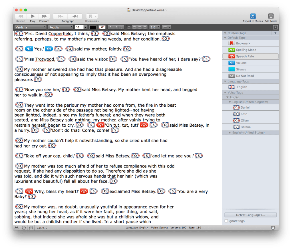 You can tag your text to use different voices, change speech rate and volume, add silences, and exclude sections from reading. To test this, I imported some conversation from Charles Dickens’ David Copperfield, and quickly tagged up spoken parts using the different voices provided by OS X. You can further refine that by tagging sections to be read more slowly or quickly, and at different volumes.