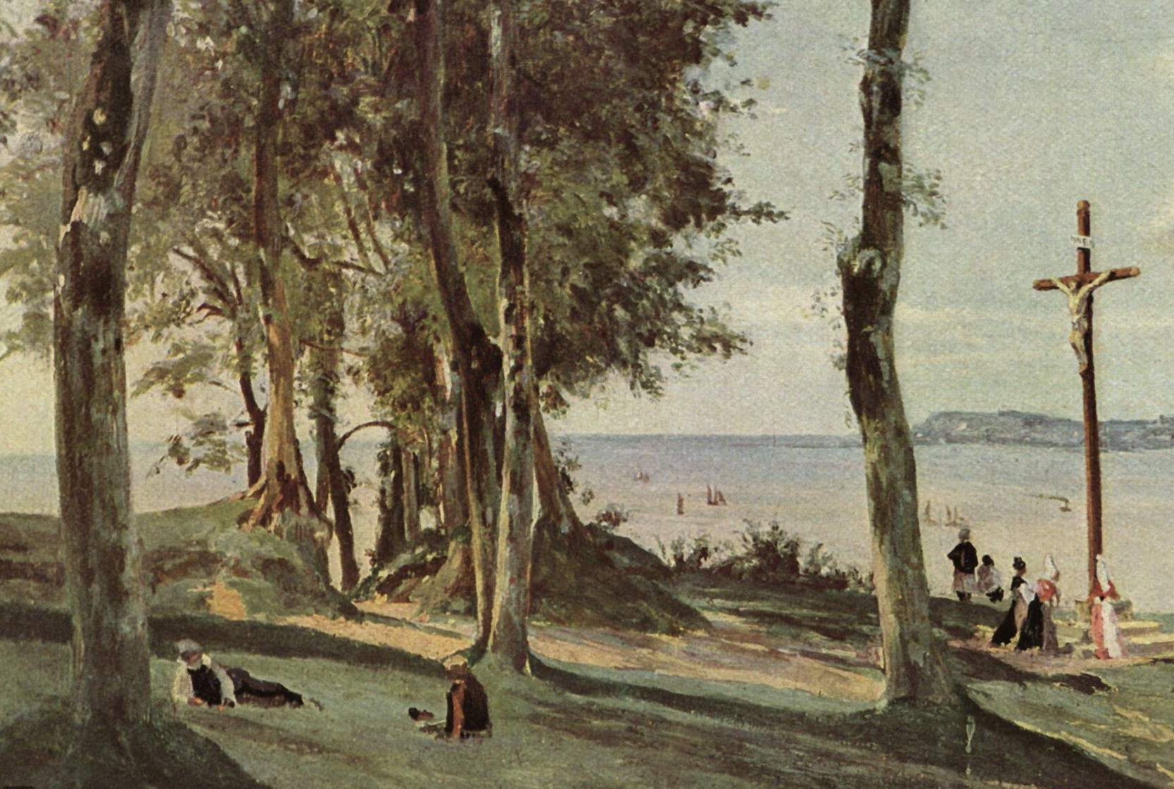 Corot’s earlier paintings, including those made plein air, usually attained a relatively high degree of finish, and lacked explicit brushstrokes and similar marks. However, in Honfleur: Calvary (c 1830) his facture is visibly looser, and those marks more gestural.