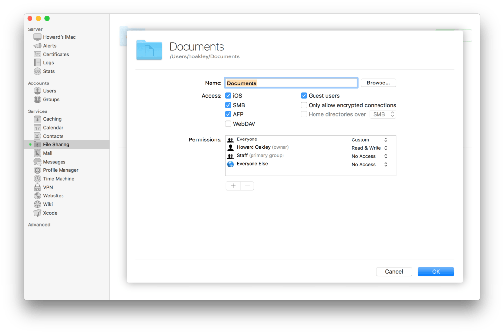 A much better option for all but occasional use is OS X Server‘s more sophisticated file sharing, which also now extends to iOS devices.