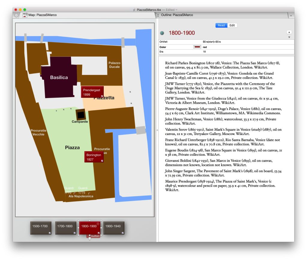 To finish off, I have dragged and dropped my plan of the Piazza into the Map view, resized it with the Shift key held to retain its proportions, then added some appropriate content, and some example paintings for you to try out. These are included in the copy of the Storyspace 3 document which you can download here: PiazzaSMarco