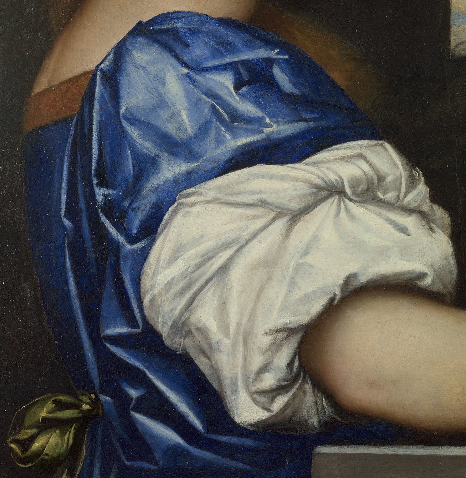 Although perhaps not by the hand of Bellini himself, Madonna and Child with Saint John the Baptist (c 1490-1500) is a good example of the fine modelling of textiles and textures without making brushstrokes apparent, as shown in the detail below.