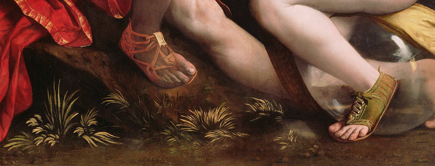 But explaining away brushstrokes in the work of Dosso Dossi (1490β1542) as being merely the result of Venetian influence is more difficult. His Allegory of Fortune (c 1530) may look impeccably smooth, but as the detail below shows, it is here that the vegetation, rather than fabrics, is formed from brushstrokes. I should draw attention to the fact that this work is on canvas, unlike the others shown in this article, but of course you cannot explain that vegetation away from the difference in support.
