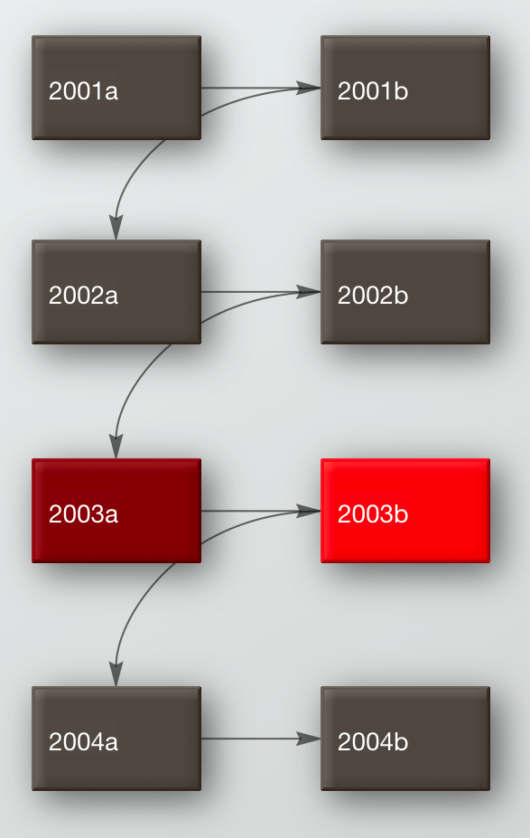 Consider a narrative in which a series of events occurs each summer, between the years 2001 and 2004, with a crisis building during the summer of 2003, which forms the crux of its storyline. This could be a series of experiments in a seabird colony or particle collider, seasons of plein air painting on the coast, or pure fiction. These could be represented in Storyspace’s Timeline as below.