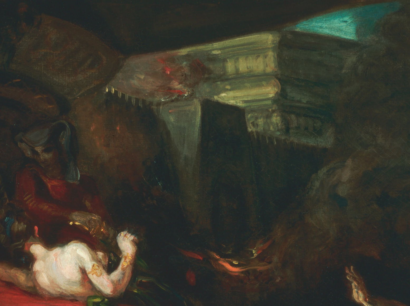 In the left foreground, a slave is struggling to bring Sardanapalus’ horse, with gold and jewels in its bridle and saddle, presumably so that it too will be killed.