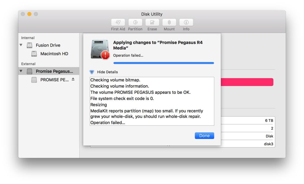 MediaKit reports partition (map) too small. If you recently grew your whole-disk, you should run whole-disk repair. Operation failed…