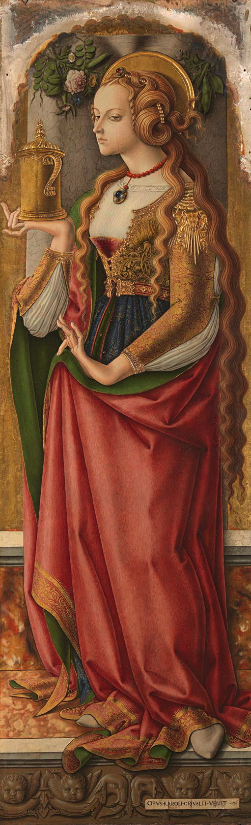If they were to have any symbolic meaning, the only suggestion which has been made is that they are phallic symbols: hardly a likely explanation in these examples. Neither does Crivelli restrict them to his paintings of the Virgin: Mary Magdalene clearly needs their company too.