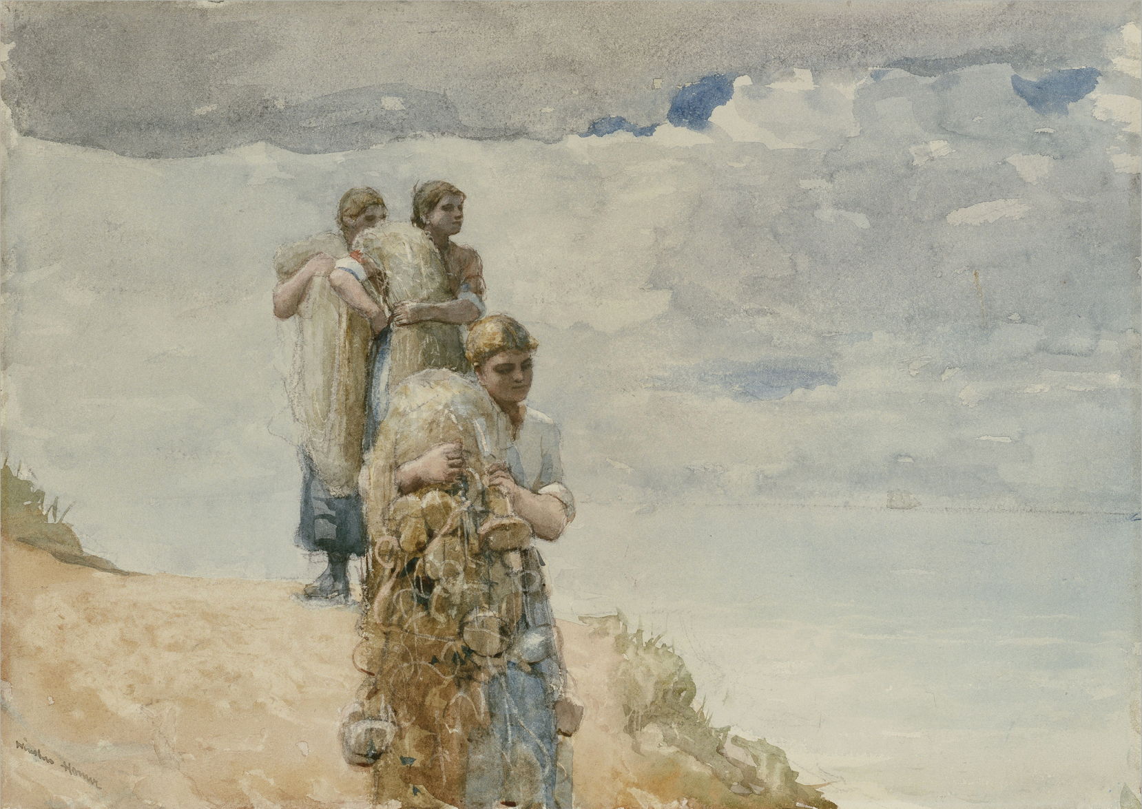 Winslow Homer (1836–1910), Three Fisher Girls, Tynemouth (1881), watercolor over graphite on wove paper, 29.85 Γ— 48.9 cm, National Gallery of Art, Washington, DC. Wikimedia Commons.