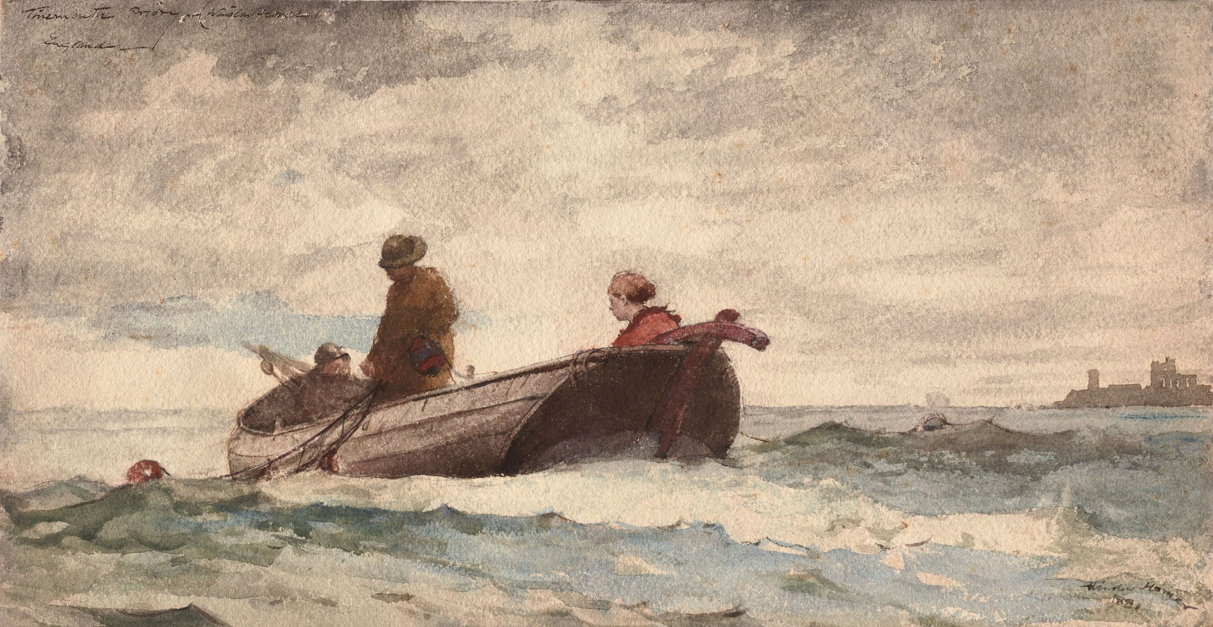 The last painting in this group is one of Homer’s most enigmatic. Known as Tynemouth Priory, England (1881), the priory of the title is seen in silhouette on the horizon at the far right, hardly a dominant passage in the painting. Its motif is a boat, presumably from Cullercoats, hauling in its net. But the boat has no sail, so could only have been propelled by oars, which are nowhere to be seen. Stranger still is the apparent woman (with a bright red jacket and tied back hair) at the helm of the boat.