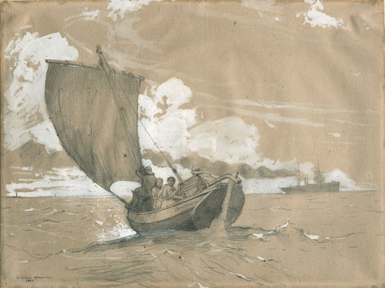 Although his production of sketches and watercolour paintings appears to have been quite intense and sustained, Homer also painted a few works in oils whilst at Cullercoats. His Hark! The Lark! (1882) was shown at the Royal Academy in London in 1882, but does not seem to have had much impact. It lacks the remarkable freshness and spontaneity of his watercolours, resembling the rustic Realism of Jean-François Millet, perhaps.