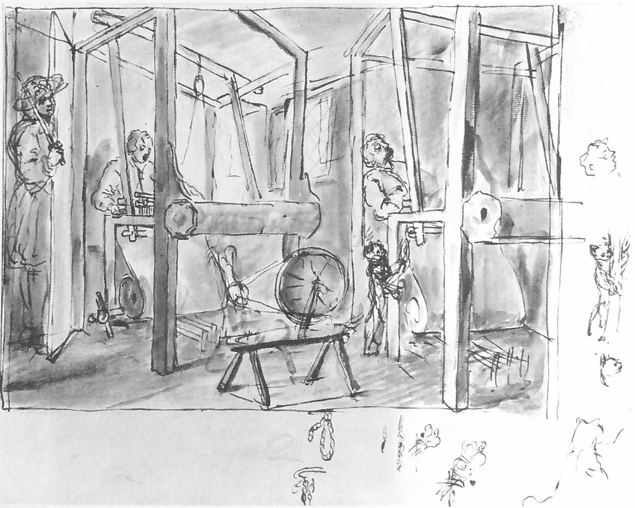 I have been able to find preparatory drawings for all the prints in the series, apart from the twelfth and last. In most cases, there is an early rough sketch and a late or even final drawing from which the plate was made. In the series below, I add a final version which is the print mirrored, as if it were the plate. I provide those because the prints shown above are mirrored from the drawings, an artefact of the printing process; showing a mirrored print makes it easier to compare the drawings with the final printed version.