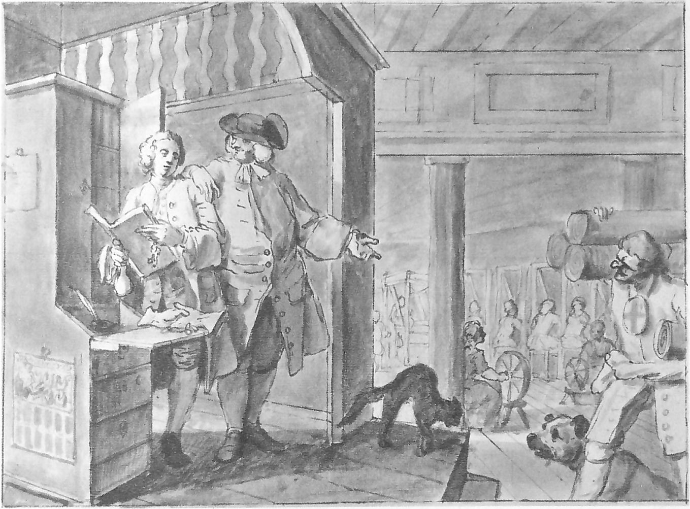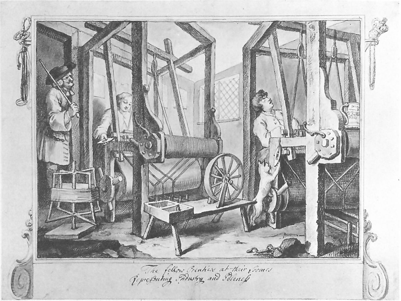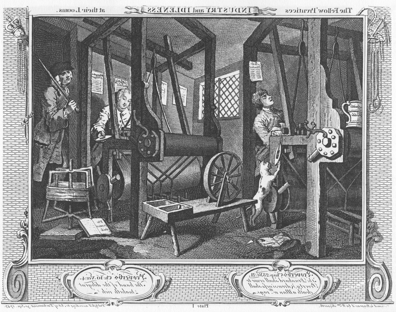 In the first print, Hogarth shows the two apprentices together at their work, their Master at the far right. Goodchild, to the right of centre, is labouring away at a hand loom, which has not yet incorporated the fly shuttle invented by Kay in 1733. By his feet is an open book, with the title The Prentice’s Guide.