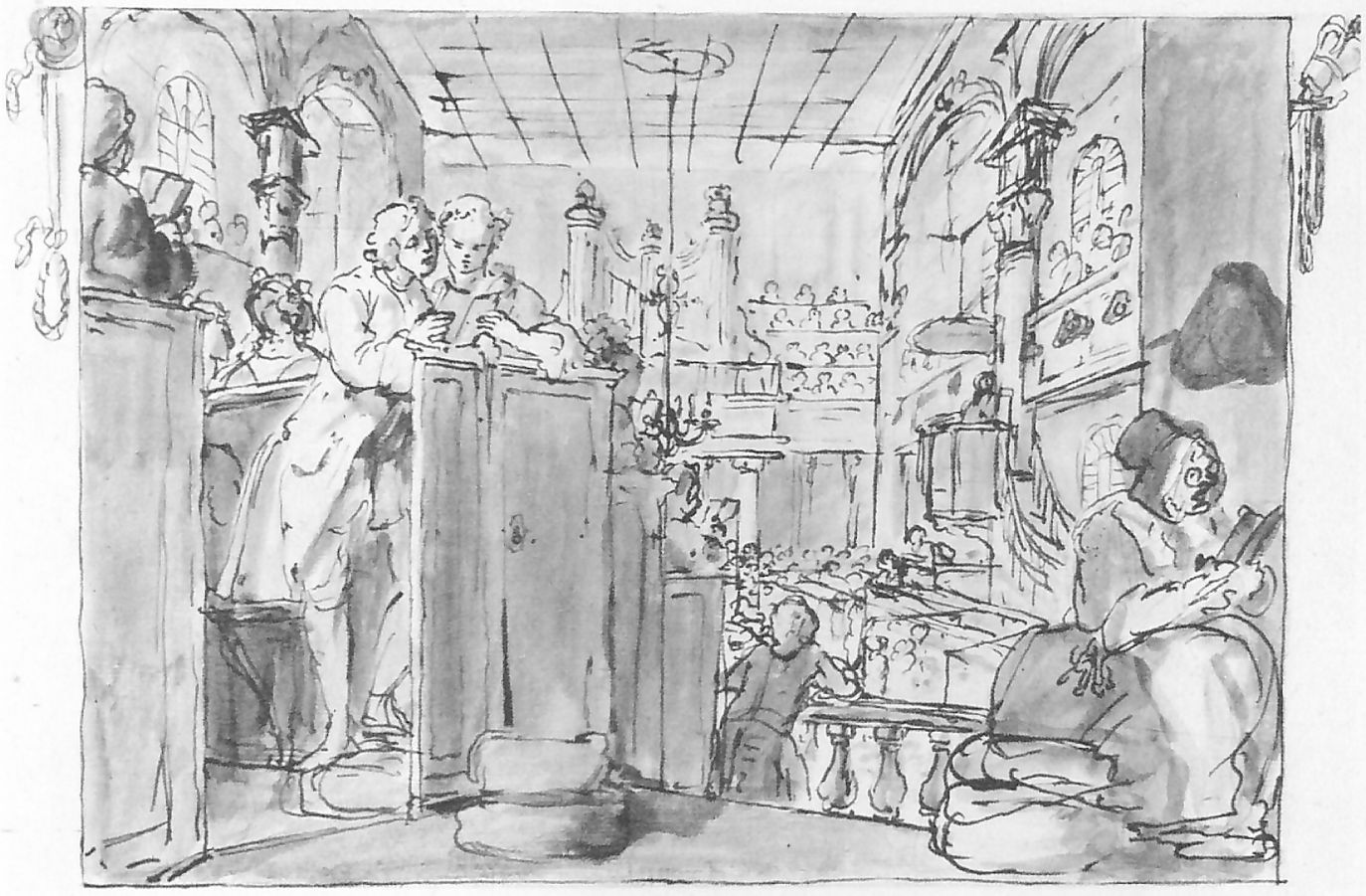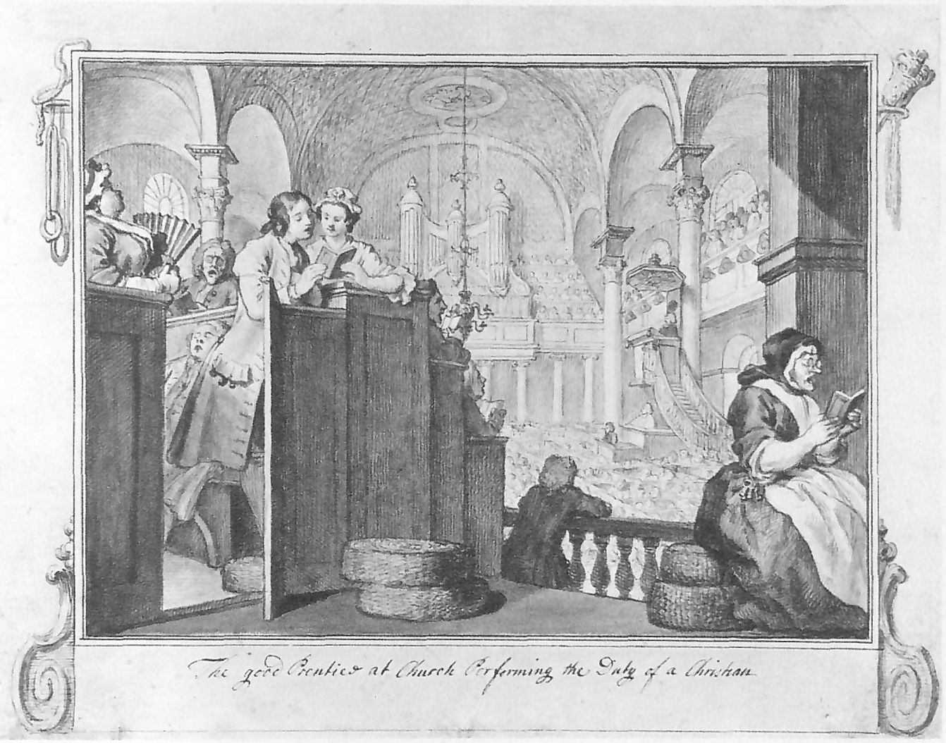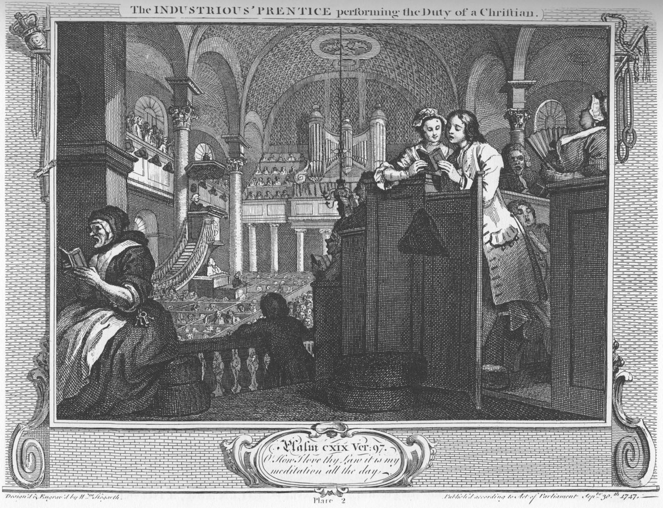 The prints now trace their separate ways, first with Goodchild’s pious and upright lifestyle, in church (probably St Martin’s-in-the-Fields) on a Sunday. He stands in a pew, sharing a hymnal with the Master’s daughter. By Goodchild is a large and buxom woman, possibly the Master’s wife, keeping a close eye on the couple. At the left is a caretaker and pew-opener with her bunch of church keys. The preacher is in the distant pulpit, under which are a clerk and a reader.