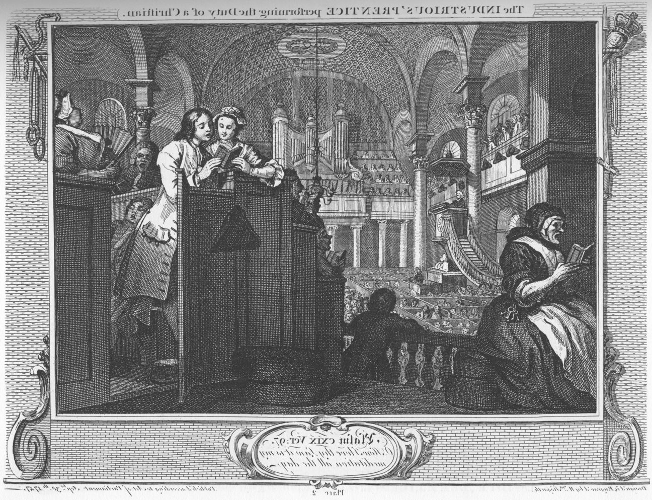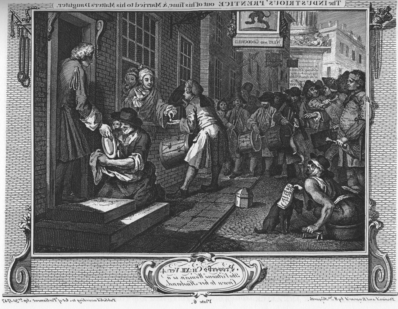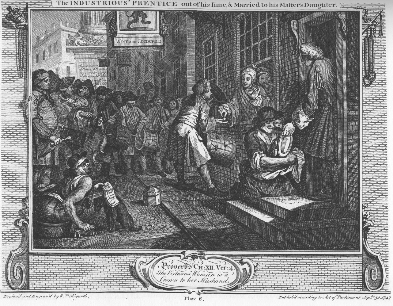 Two apprentices (‘prentices in Hogarth’s usage), named Francis Goodchild (the industrious ‘prentice) and Thomas Idle (the idle ‘prentice), start on equal terms, apprenticed to their Master, a Mr West. They behave true to form, with Goodchild diligently working and attending church, and Idle being idle whenever he could, gambling and cheating out in the churchyard rather than going to church. Goodchild is rewarded by promotion at work, gaining more of his Master’s trust; Idle, though, ends up going to sea and abandoning his apprenticeship. Goodchild then marries his Master’s daughter, in contrast with Idle, who returns from sea to lodge in a garret with a common prostitute.