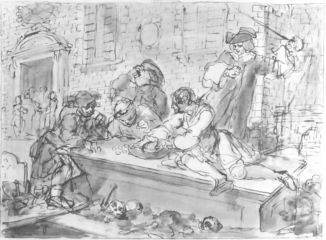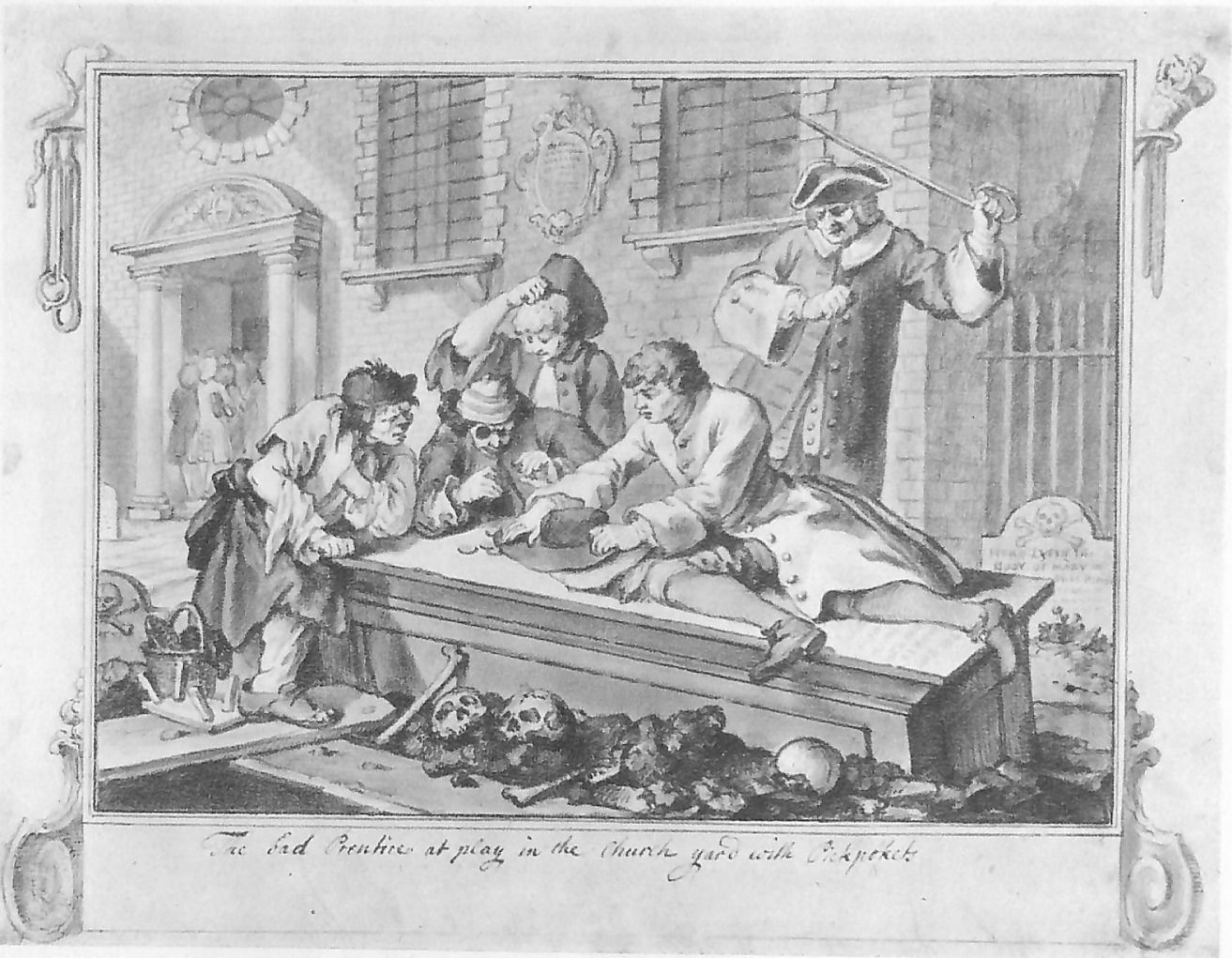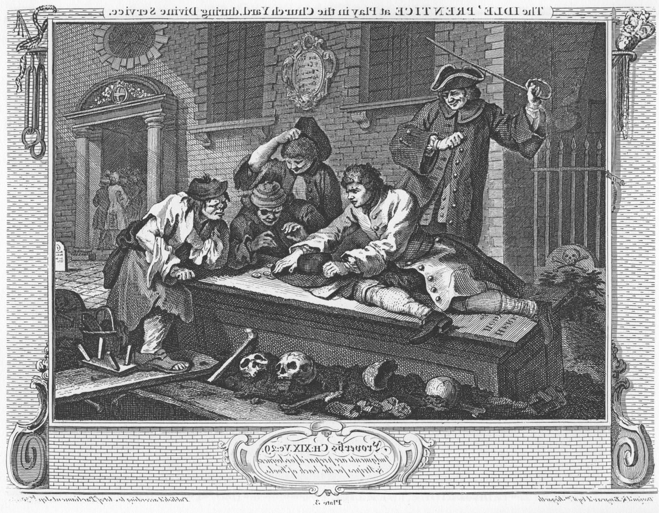 While Goodchild is inside attending the service, Idle is seen gambling on a tombstone, in the company of three other aspiring minor villains. The church shown here is probably St Michael’s in Crooked Lane, or St Paul’s in Shadwell. In the foreground is an open grave which is planked over, with skulls and other remains behind. At the rear left is an irate churchwarden, with his cane raised, who has come to break up the group and move them on.