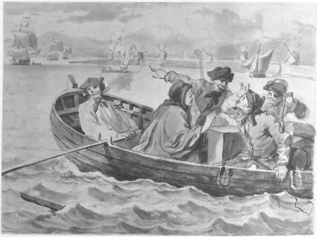 His colleagues in the boat are sailors, who are teasing him with a cat o’ nine tails whip, and pointing out a body hanging on distant gallows, as a portent of Idle’s future. On the shore in the distance, there are also four windmills, which were common in the area at that time.
