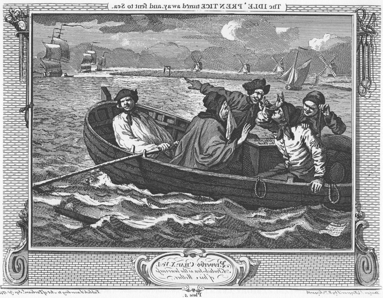 Idle has abandoned his apprenticeship, tossing his indenture papers into the waves at the far left, and goes to sea. Hogarth shows him being rowed out to join his ship at Cuckold’s Point on the River Thames, opposite what were then the West Indian docks, between Limehouse and Greenwich. With Idle in the boat is his mother, who appears to be protesting his departure.
