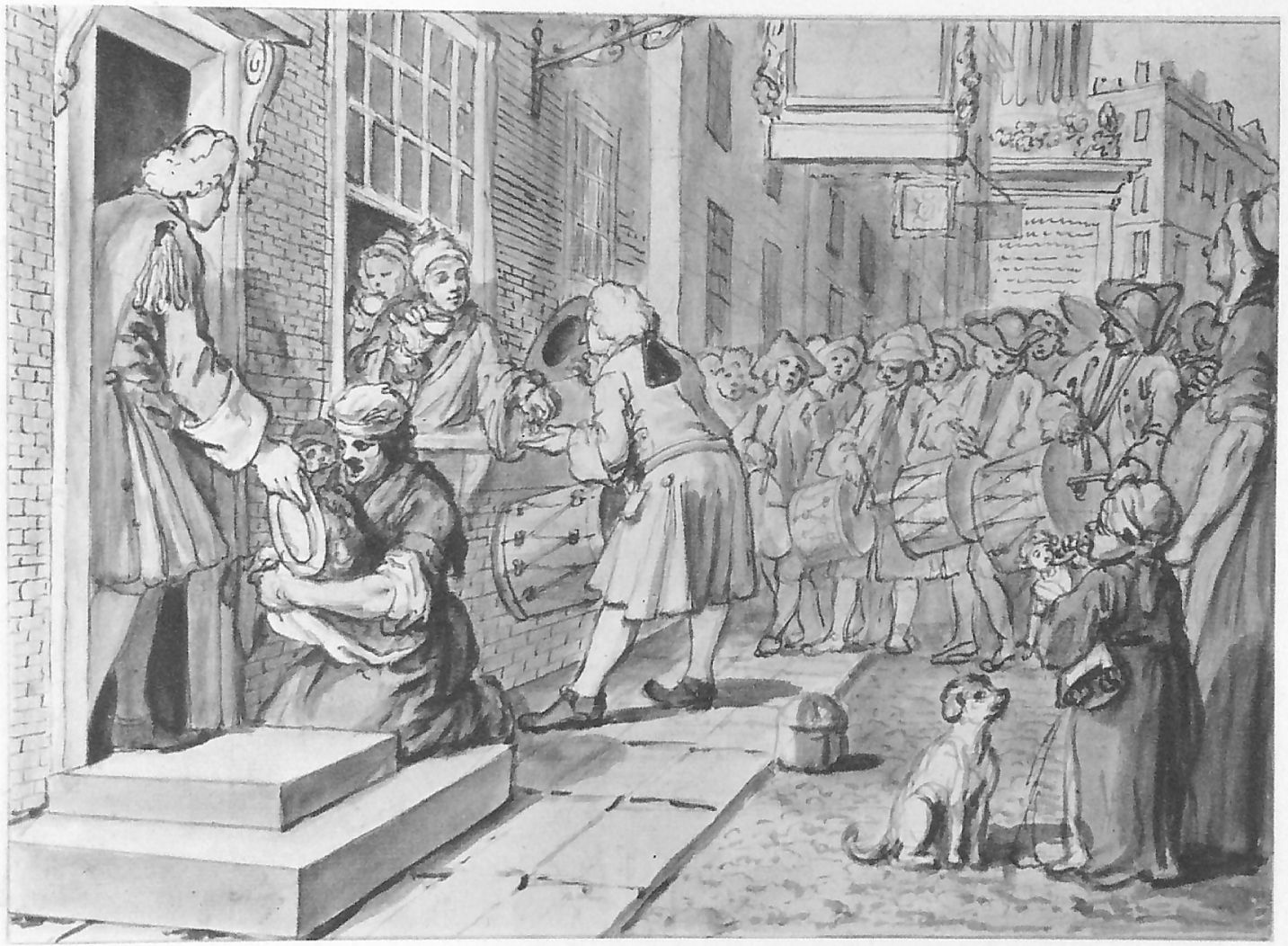 For all his previous series, Hogarth had made paintings from which engravings were then made. Although it is sometimes stated that this series was created “solely” as engravings, the engravings were of course made from Hogarth’s drawings, and most of the latter remain, in the British Museum. Its set was owned by Horace Walpole (1717-1797), son of the first Prime Minister Sir Robert Walpole. They were acquired by the Museum in 1896.
