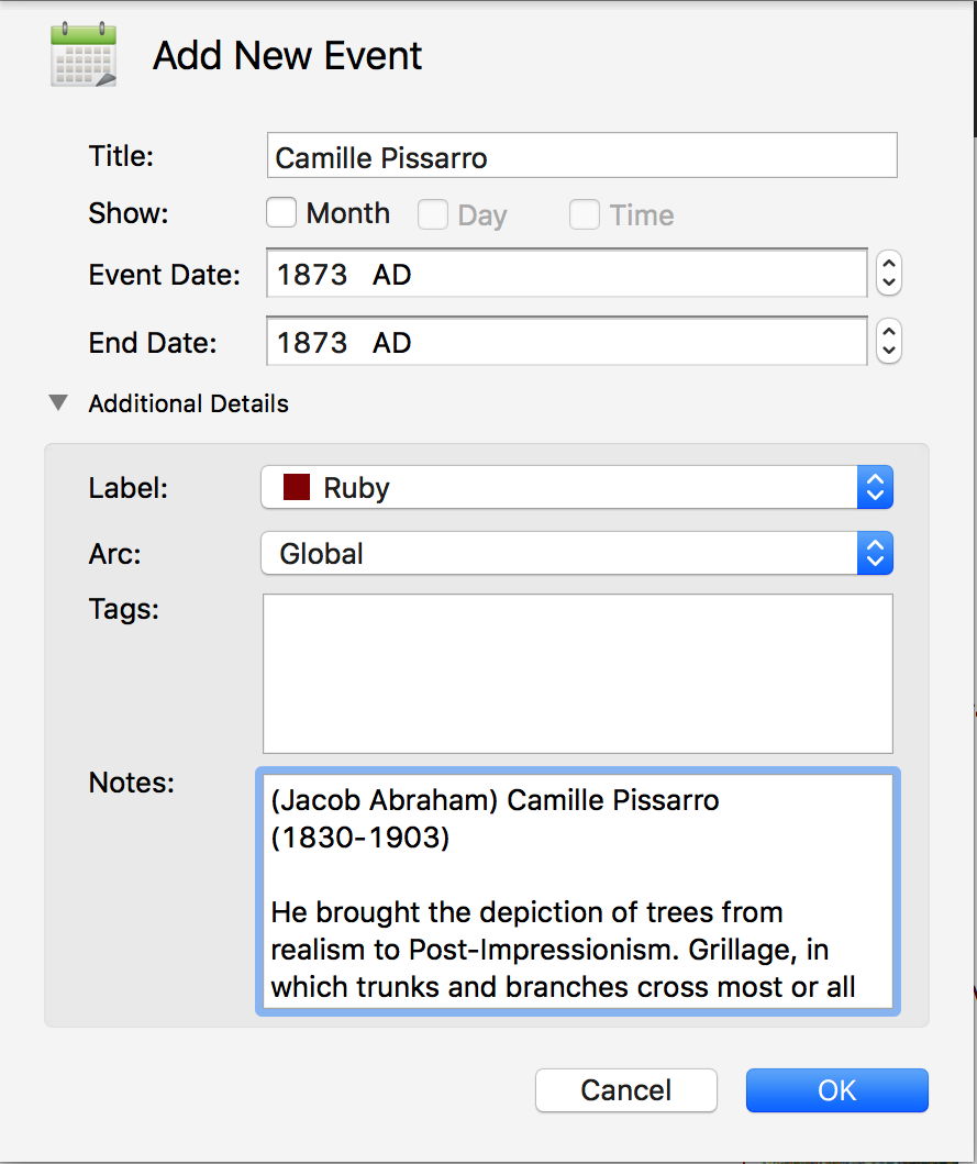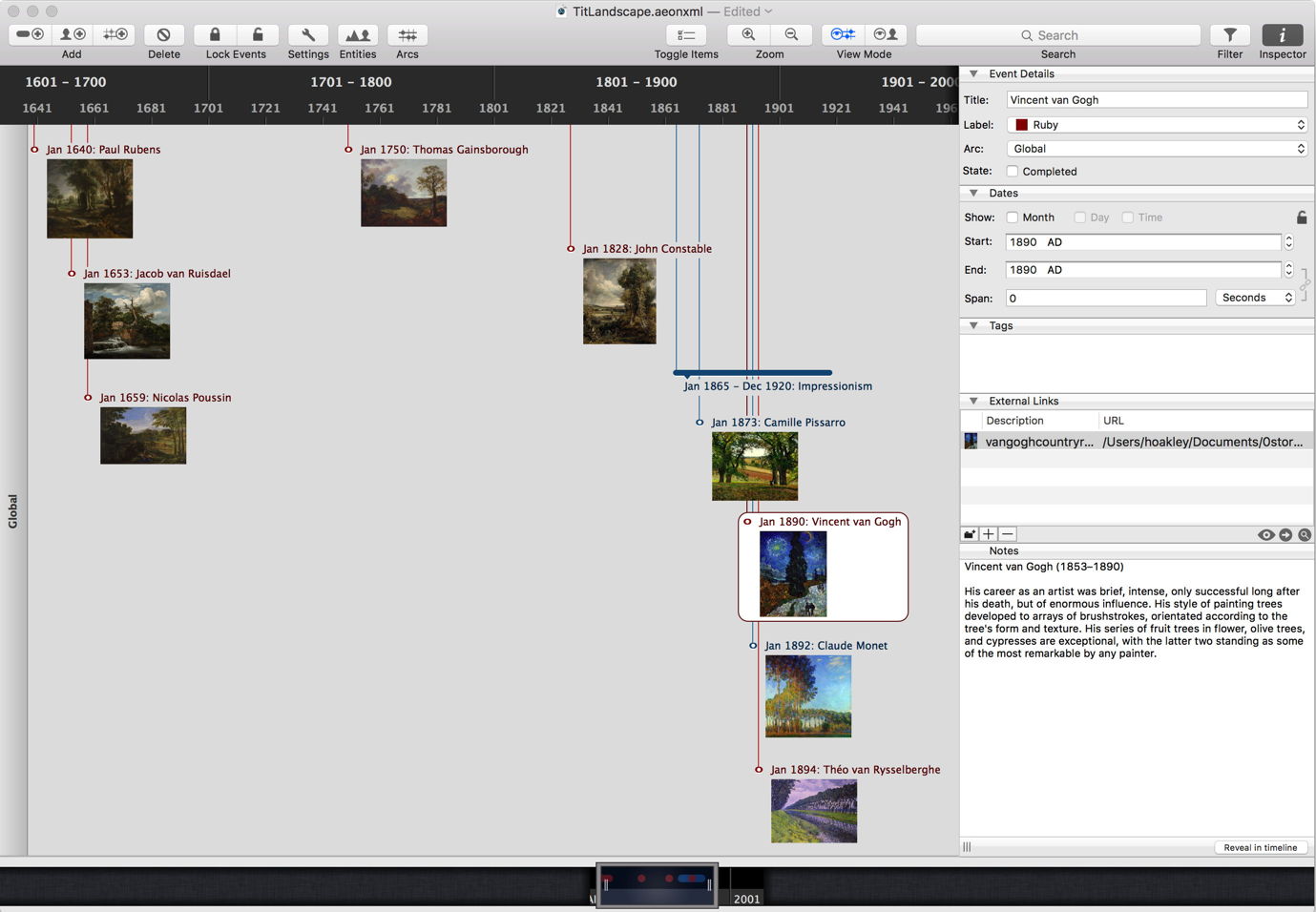 It also does simple jobs, such as my timeline of paintings of trees, very well. Starting at that basic level, you just click the Add New Event tool at the top left of its window, and fill in the blanks for your first event. This new event editor does not give access to all the data for an event, but gets it on the timeline ready for completion using the Inspector.