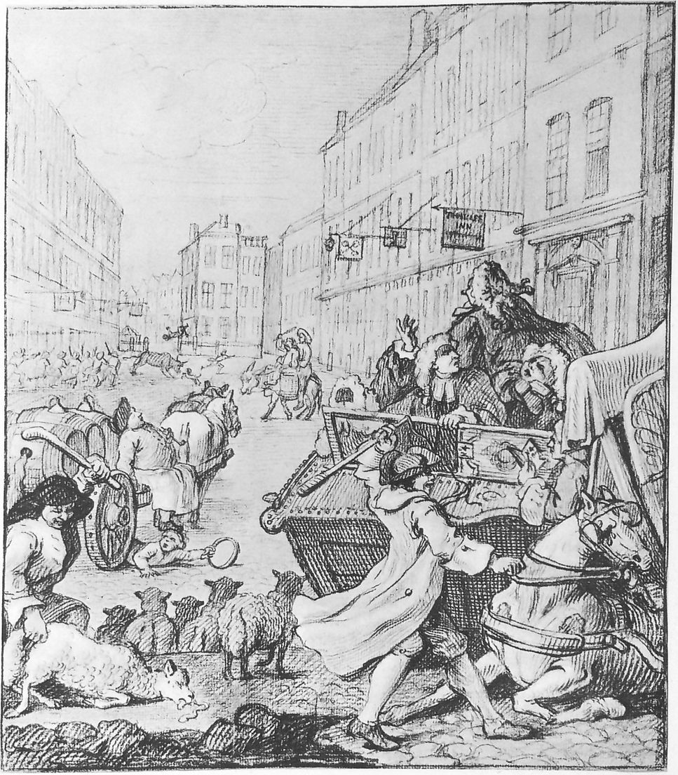 Inside Tom’s carriage are four large barristers, who struggle to get out. Also in the foreground, a drover is beating a sheep to death, a small boy is being run over by a brewer’s dray while the drayman sleeps, an overloaded ass is driven on, and an enraged bull has just tossed one of its tormentors.