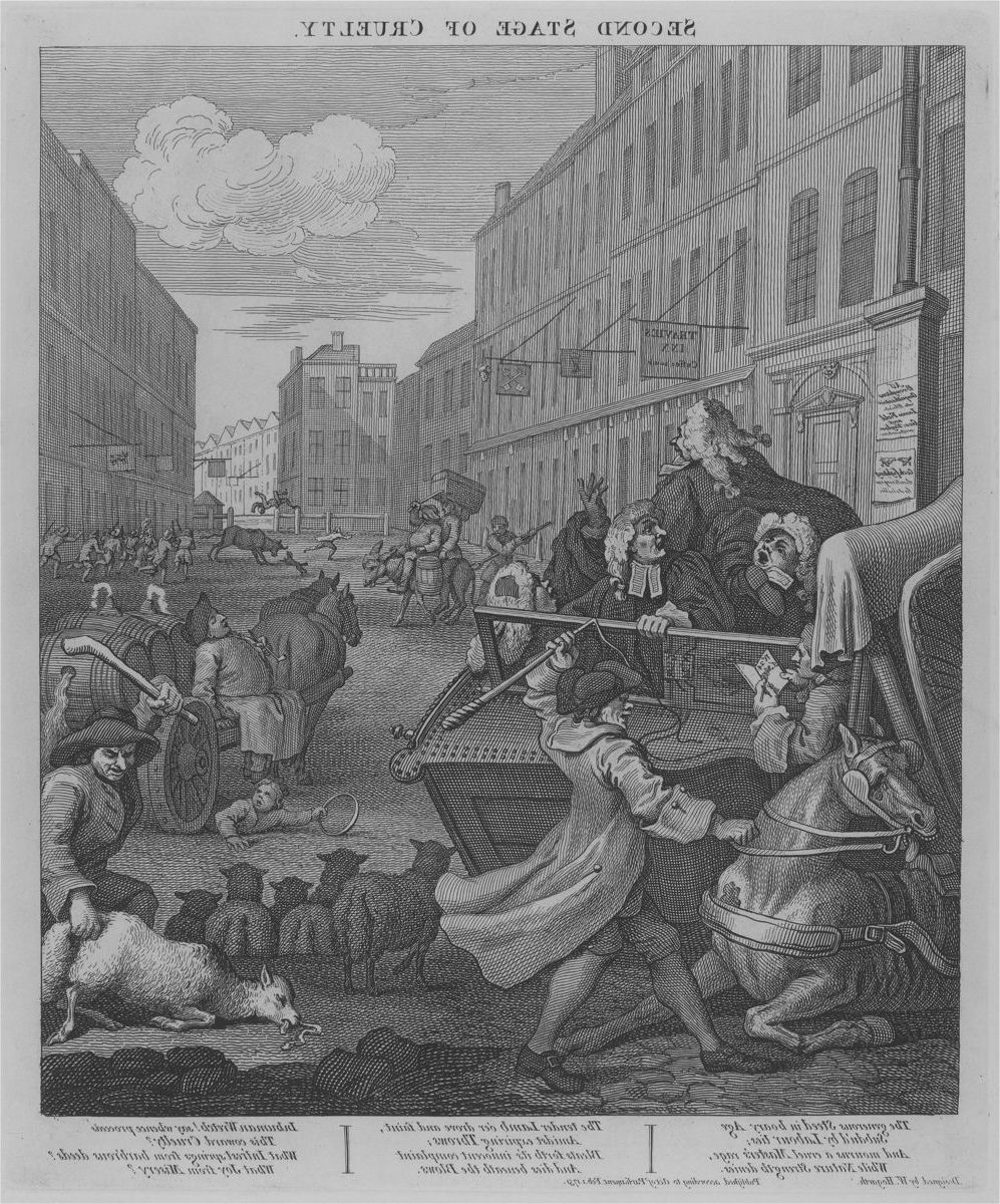 Following his successful narrative series of prints Industry and Idleness, William Hogarth (1697-1764) decided to moralise again over one of his favourite issues: cruelty to animals. Victorian society was even harsher in its attitudes towards animals than it was towards the ‘lower classes’ of humans, and Hogarth saw the two as being linked.