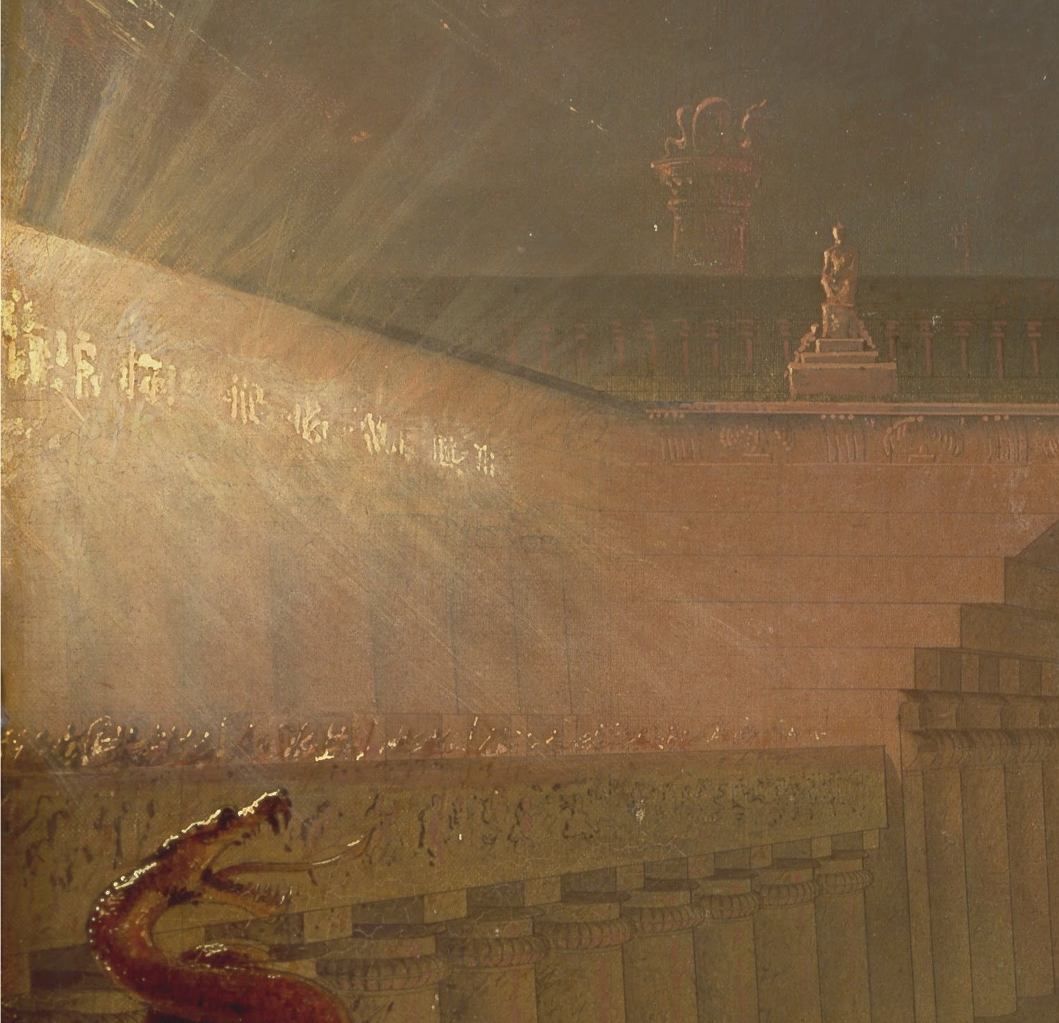 Martin chooses a different moment in the story, and the other end of the scale as far as its pictorial scope. The thousand lords are shown feasting in vast open-roofed halls. Above them are the famous Hanging Gardens of Babylon, with the Tower of Babel in the distance, and a ziggurat slightly closer.