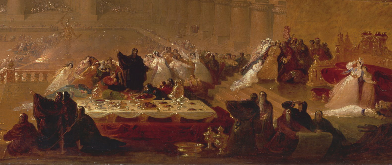 The Top Tables are in the foreground, Daniel standing prominent in a black cloak explaining the meaning of the words. Belshazzar and his royal entourage are recoiling in shock around his throne at the far right.