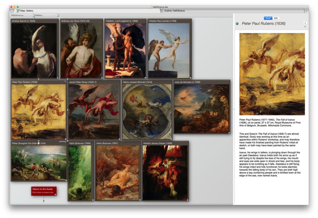 In the previous article, I have written an account of the different approaches used in paintings showing the story of Daedalus and the fall of Icarus, as given in Ovid’s Metamorphoses. As I was completing that, I was also transforming it into a hypertext document using Eastgate Systems‘ Storyspace 3 app. This article provides a copy of the first version of that hypertext, which you can explore, and explains how I designed and implemented the hypertext version.