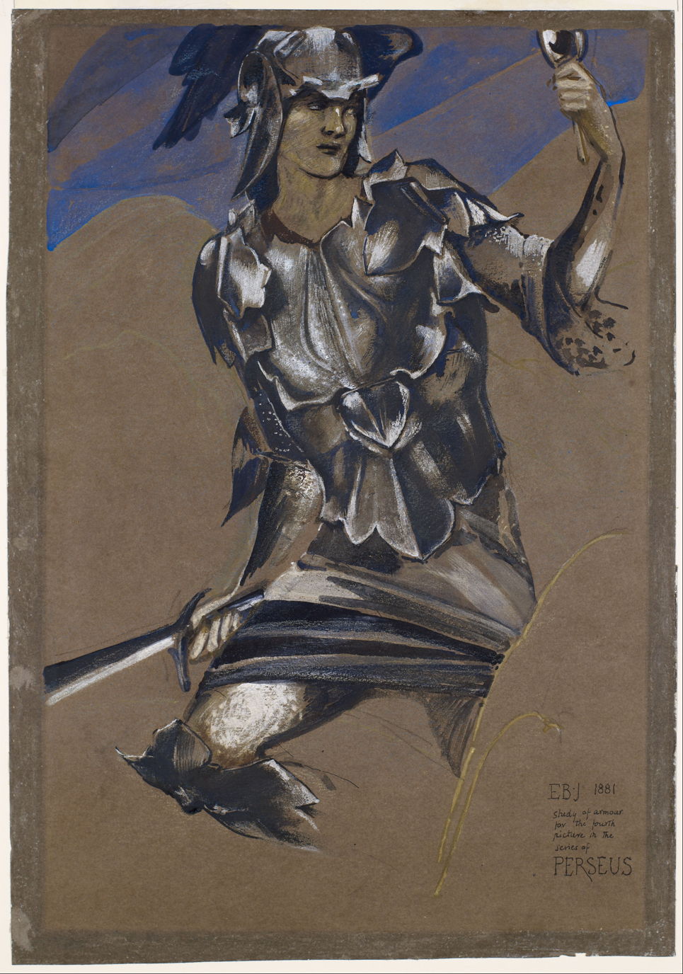 Edward Burne-Jones (1833–1898), The Perseus Series – Study of Perseus in Armour for The Finding of Medusa (1881), watercolour, bodycolour, silver medium and chalk on brown/grey paper, 26.3 x 37.6 cm, Birmingham Museum and Art Gallery, Birmingham, England. Wikimedia Commons.