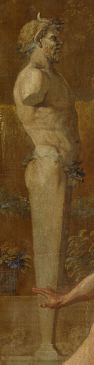 More usually seen with an oversized and erect phallus, and abundant in Roman towns, Poussin has opted for a touch of decorum in depicting the god of gardens and fertility, who was an inevitable associate of spring and its flowers. His phallus is wreathed in greenery too.