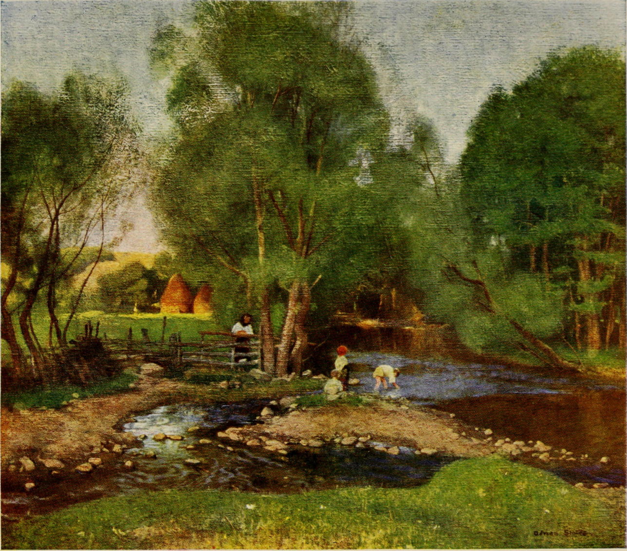 Adrian Stokes was born in Southport, Lancashire, but moved to Liverpool as a child, then to London in 1871, where he exhibited with the Royal Society of British Artists. His talent was spotted, and he enrolled in the Royal Academy Schools in London as a student in 1872. He first exhibited at the Royal Academy in 1876. That year he went to France, visiting the Pont-Aven artists’ colony in Brittany, and was influenced by Jules Bastien-Lepage, among others. At that time, most of his paintings appear to have been commissioned portraits.