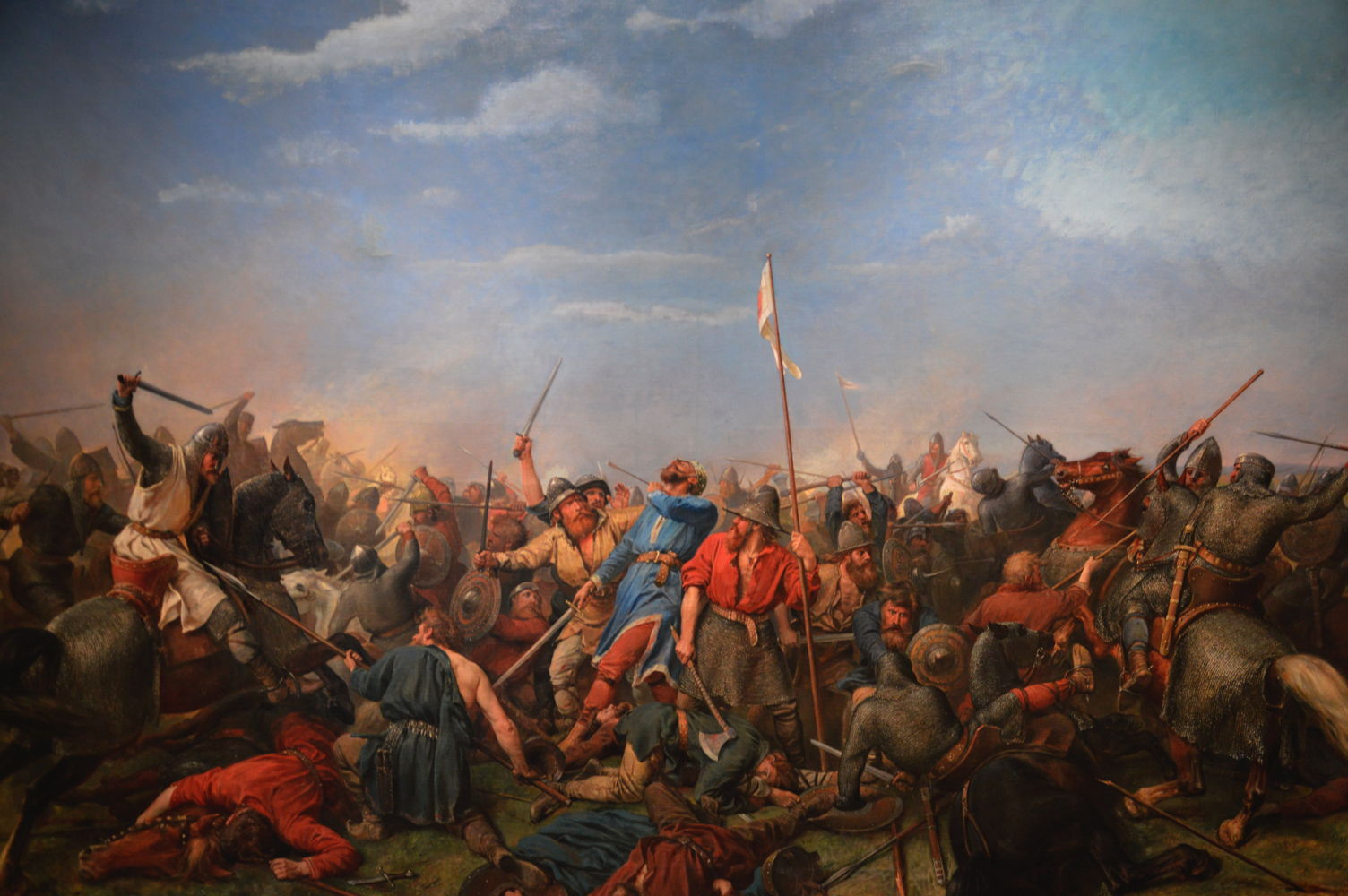 The Norwegian force was led by King Harald Hardrada and the English king’s brother, Tostig Godwinson. The English force was led by the King of England, Harold Godwinson, who died less than three weeks later at the Battle of Hastings, and so yielded his throne to William, a Norman. On 25 September 1066, King Harald Hardrada was killed when he was hit in the neck by an arrow, as shown in the centre of Arbo’s atmospheric painting. Tostig Godwinson and most of the Norwegian army were also killed.