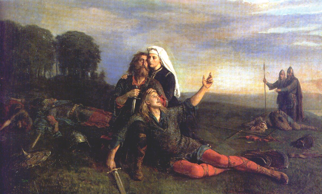 Hervör’s Death (1880) shows this shieldmaiden – who in many respects resembles a Valkyrie in her dress – dying in an inheritance conflict. She was leading an army against an assault of a much larger army of Huns. The conflict arose between her brothers, Hlöd and Angantýr, and it has been suggested that the men shown represent her foster father Ormar, and brother Angantýr. This appears to be a variation on the accounts of the Poetic Edda, where she is mourned by those men in Árheimar rather than on the battlefield as shown.