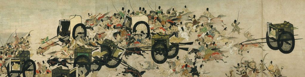 Reaching the left edge of that mass, there is a group of rebels outside the palace grounds. Further to left, the rebels have now entered the grounds, then enter the buildings. There Fujiwara no Nobuyori orders the retired Emperor into an ox cart. The palace buildings are set alight, and their occupants try to flee the fierce flames and billowing smoke. As the flames die out, the rebels leave the palace grounds. Far to the left the retired Emperor is seen in his ox cart, surrounded by rebels. As they take him away, at the front of the column is Fujiwara no Nobuyori, the rebel leader.