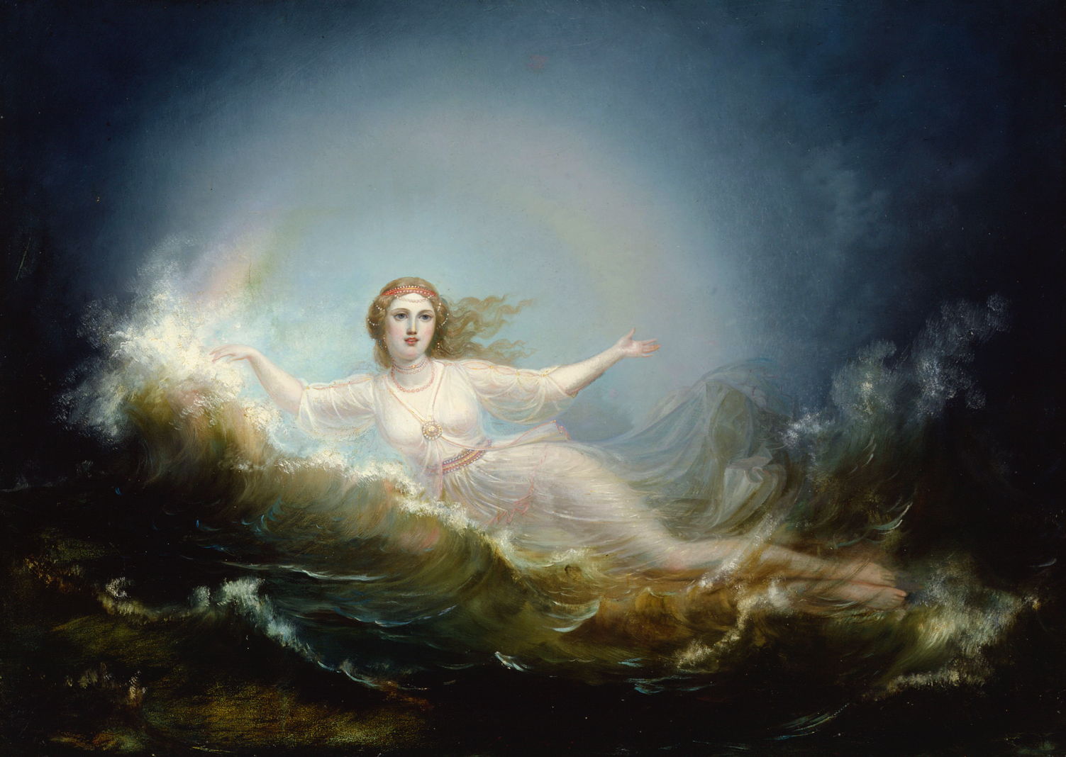 Ekman’s Ilmatar (1860) shows the daughter of the sky, herself the virgin spirit of the air, who is impregnated by the sea and wind, then models the earth, and gives birth to Väinämöinen, who swims to the shore. This is the start of the creation myth detailed in Song 1 of the epic.