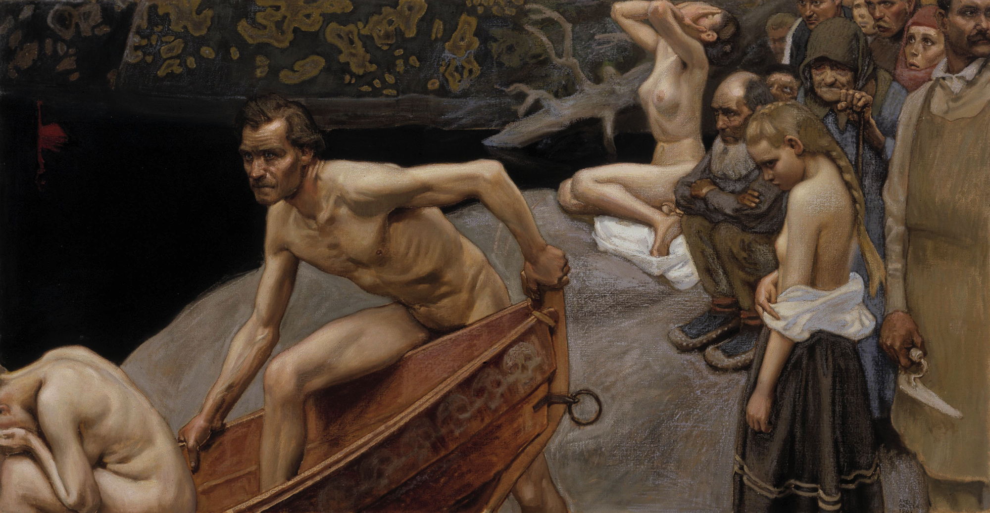 The grandest mobile painting of his career, Gallen-Kallela’s Aino Myth (1891) is a triptych set in a gilt frame with quoted text from the Kalevala inset, showing scenes from Songs 4-5.
