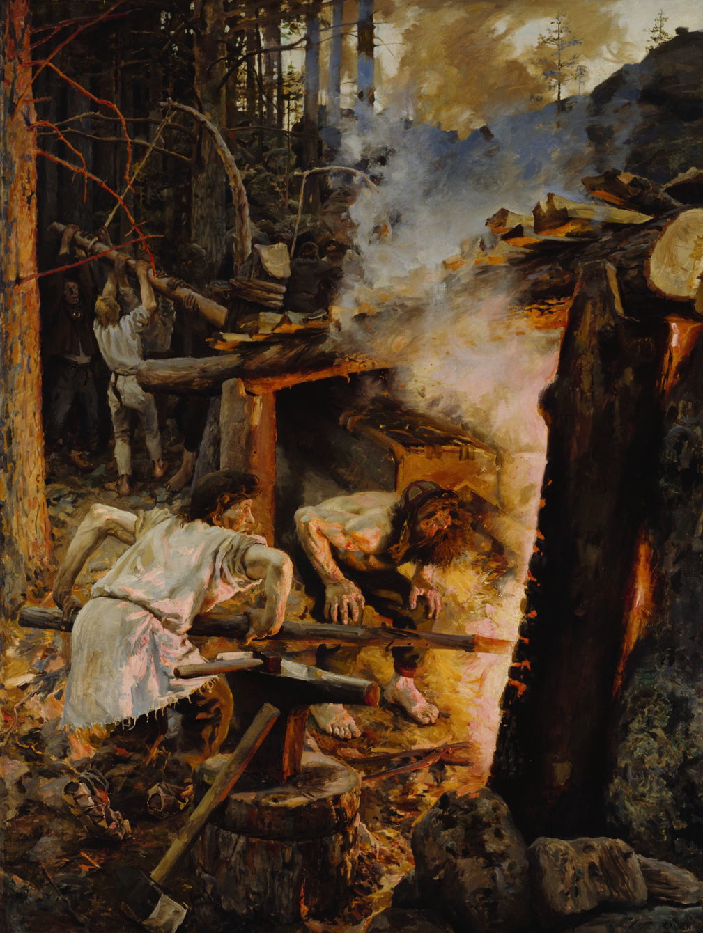 Forging of the Sampo (1893) is Gallen-Kallela’s first depiction of this central event in the Kalevala, described in Song 10. Väinämöinen returns home, and urges Ilmarinen to go to court the Maiden of Pohjola, who can be won by forging a Sampo – a mysterious talisman whose nature remains undefined. When Ilmarinen refuses, Väinämöinen uses magic to transport him to Pohjola in a whirlwind. Once there, Ilmarinen forges the Sampo, but the Maiden of Pohjola declines his offer of marriage, leaving him to return home disconsolate.