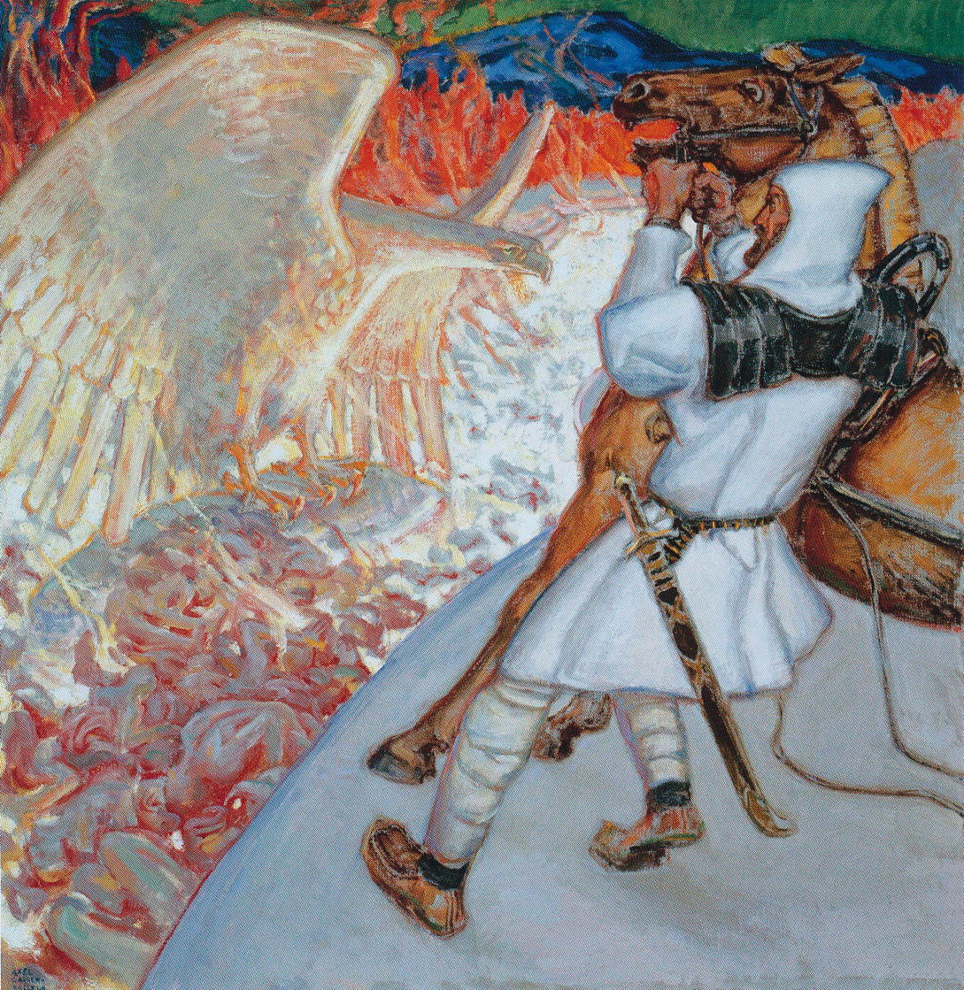 Lemminkäinen Came to the River (1920) takes the story one step further, with Lemminkäinen on the bank of the River of Tuonela, in the underworld, confronted by a fearsome white eagle which guards the bodies of the dead below.