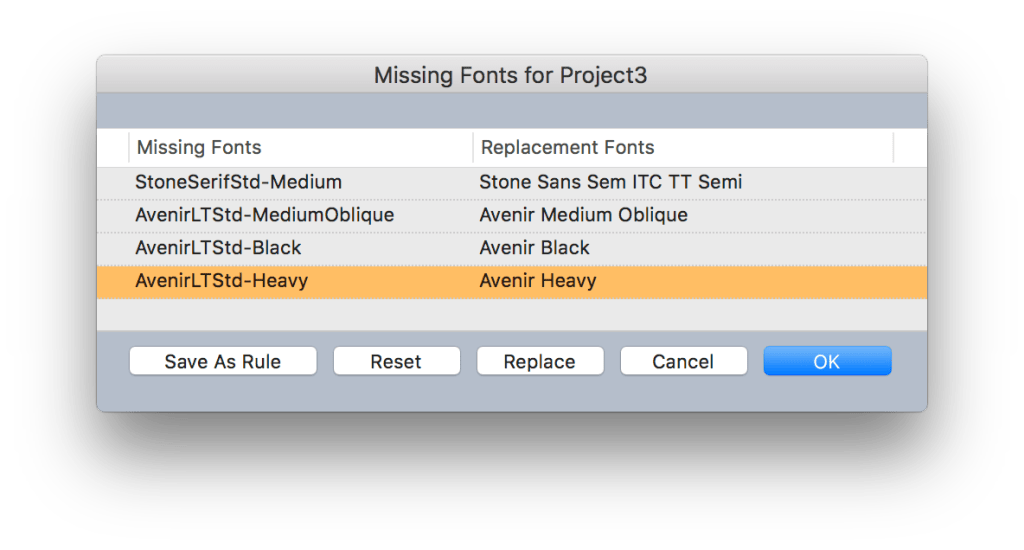 The next dialog helps you make substitutes. Select one row and click the Replace button to pick an alternative font. When these are all set, you can save the substitutions as a rule for future use, then click OK to complete conversion. If you already have all the fonts installed, you will not see these dialogs, of course.