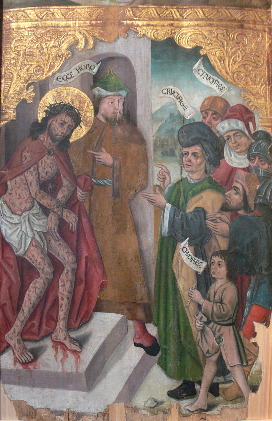 Then in the early morning, Pilate brought him before a crowd to ask what should be done with him. The Latin version of Pilate’s words in the Vulgate translation of John Chapter 19 verse 5 are ecce homo, ‘behold the man’. To this the crowd replied crucifige eum, ‘crucify him’, and Christ was then taken away to begin the process of crucifixion.