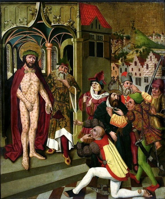 In the foreground is the corner of a building. At a higher level, a group of figures has emerged from a doorway onto a stone platform. At the front, and almost in the centre of the painting, an official is shouting angrily at Jesus, who stands to the left, his hands bound together in front of him, naked apart from a loin-cloth and a cape. There is a crown of thorns on his head, his head is bowed, his body tilted forward. His entire skin is covered by fine bleeding wounds, and there are spots of blood on the stonework, and his feet leave bloody footprints.