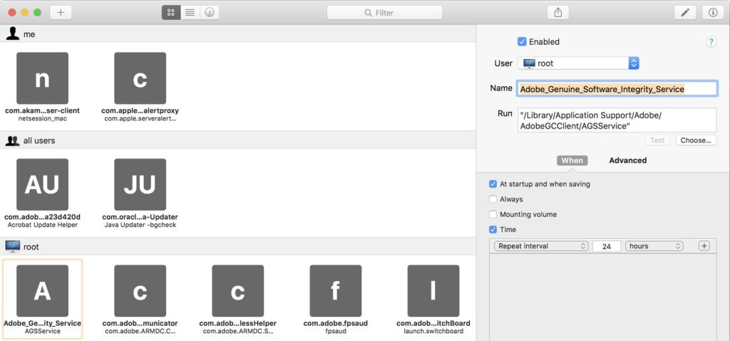 A service which runs every day might be set up like this Adobe service. Each time that my Mac starts up, and every twenty-four hours afterwards, this will automatically run the background service named AGSService. You could configure a similar service to synchronise the contents of a working documents folder with that on a file server, for example, in the same way. Instead of using a repeat interval like this, you could set a fixed time each day, perhaps.