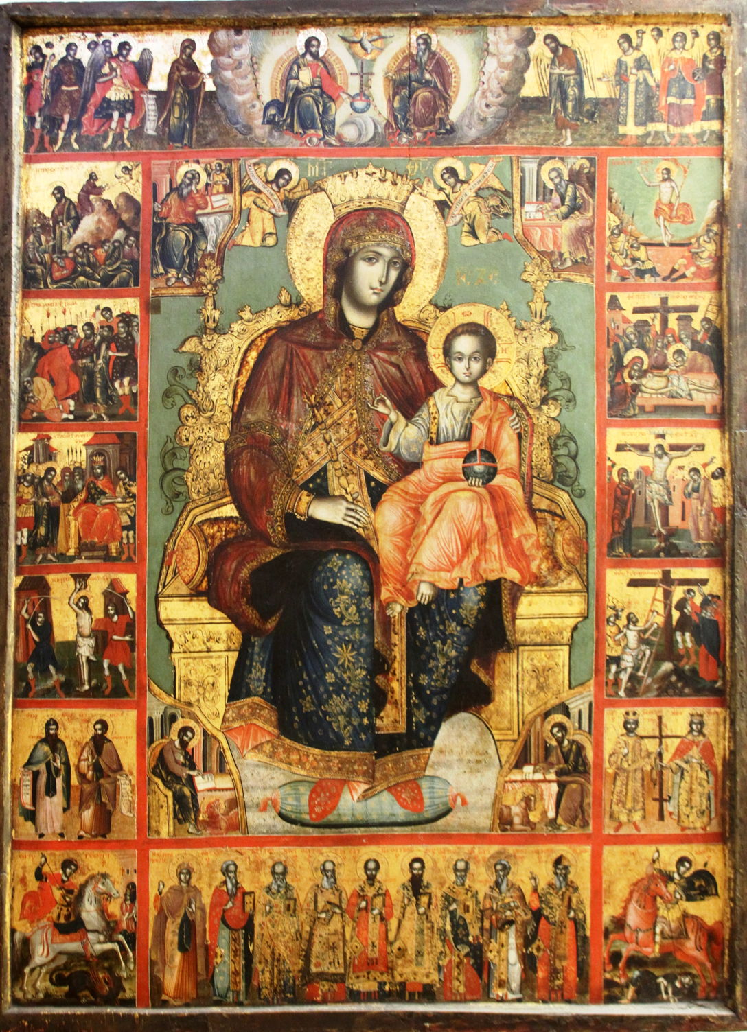 The painting of The Virgin Mary (1700s) in the Serbian Church of Szentendre, Hungary, uses a rectangular format with the Virgin and Child at its centre. Arranged around that are smaller frames, each showing an event in the life of Jesus. These appear to be read from the upper left in an anticlockwise sense, ending at the upper right with the resurrection, although only the ten frames on either side of the central image form the narrative sequence.