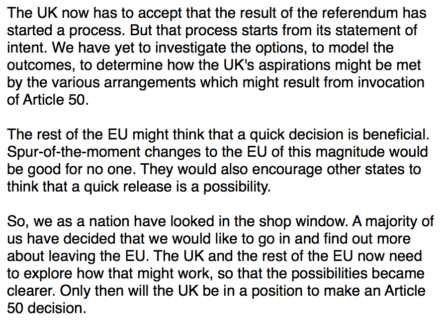 The UK now has to accept that the result of the referendum has started a process. But that process starts from its statement of intent. We have yet to investigate the options, to model the outcomes, to determine how the UK’s aspirations might be met by the various arrangements which might result from invocation of Article 50.
