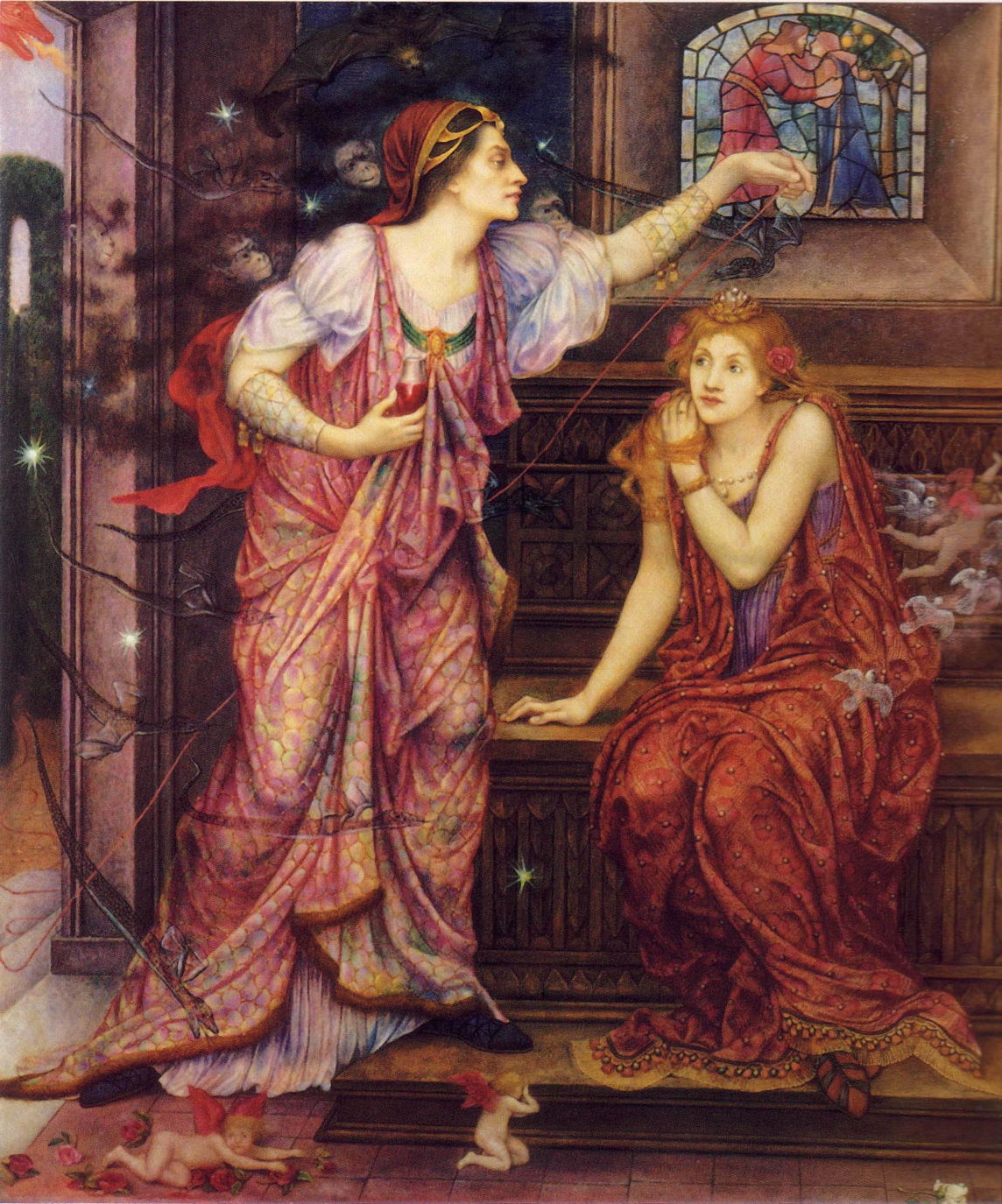 De Morgan’s powerful painting shows Eleanor at the left, her left hand still holding the red thread with which she had negotiated the maze. In her right hand is the vial of poison which she is about to administer to Rosamund, who is sat, looking dreamily into the distance, at the right. Malevolent bats and faces are shown around Eleanor’s head and shoulders, to indicate her evil intent. Lower down they transform into flying serpents, which are chasing tiny putti adorning the floor. White doves and another putto are flying away to the right, and there are occasional miniature stars around Eleanor. A stained glass window behind shows two lovers about to kiss under a fruit tree.