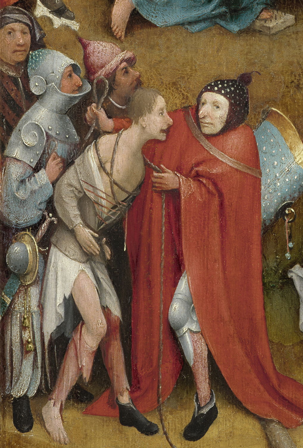 The underlying accounts in the Gospels of the New Testament are very brief, although Bosch as usual works from that of John (chapter 19 v 17), which records Christ as carrying the cross himself; the other Gospels refer to the cross being carried by Simon of Cyrene. This painting also refers to a later tradition that, of the two criminals crucified alongside Christ, one repented to become the ‘good thief’, and the other did not.