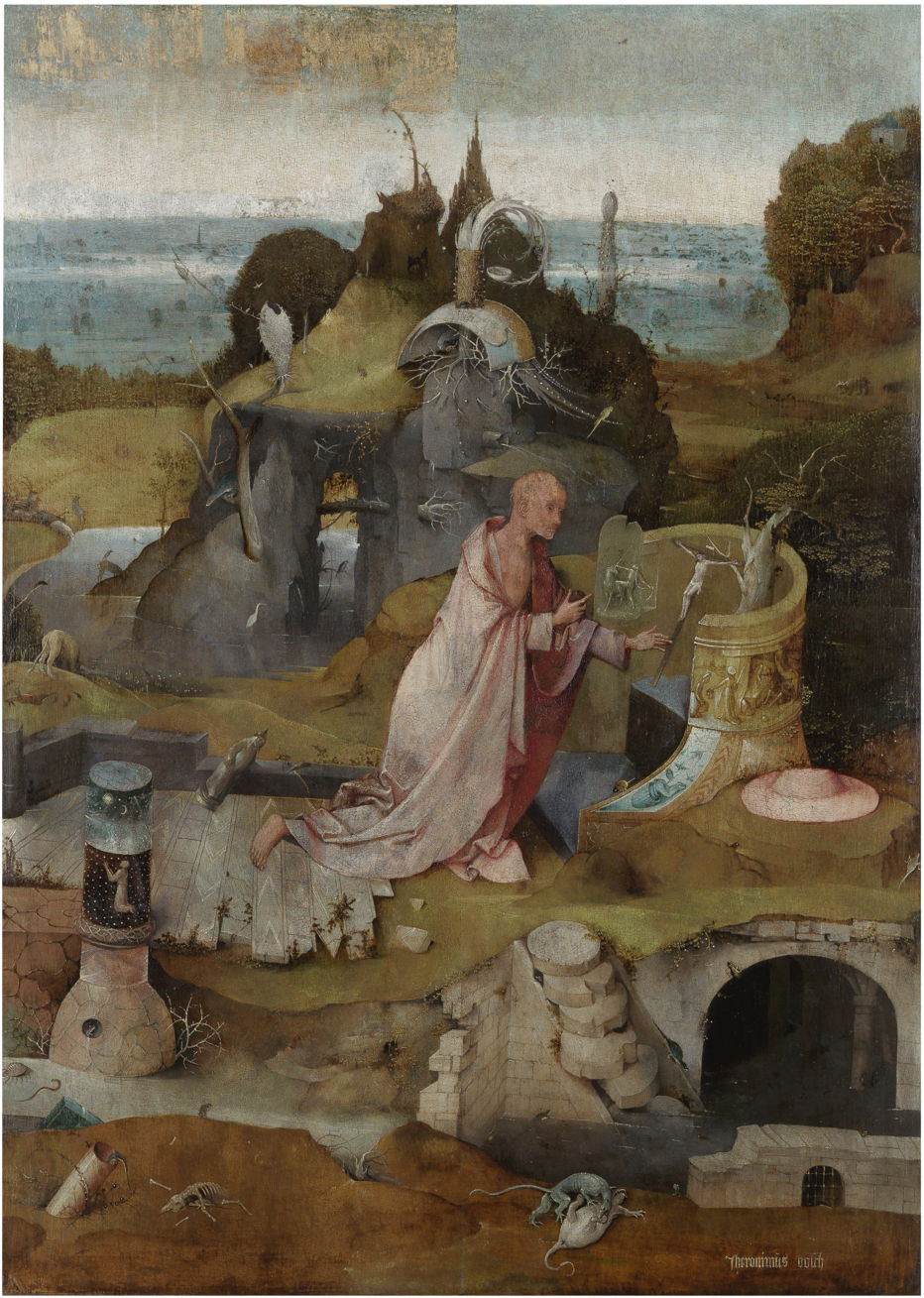 The three panels forming this triptych show the three hermit saints undergoing prayer and penance during their periods spent in ‘the wilderness’. In each panel, the saint’s head and shoulders are close to the centre of that panel, and they are at an improvised altar appropriate to their setting. They are surrounded by collections of highly inventive objects, including their attributes, and symbols associated with their lives and missions. Many, if not most, of those objects are inventions or portmanteau creations unique to Bosch.